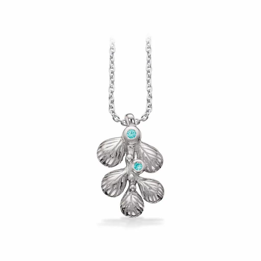 Scrouples sølv rhodineret halskæde med vedhæng som blade. Vedhænget er formet som en lille kvist med 5 blade. I mellem bladede sidder 2 turkis farvede syntetiske zirkonia. Kæden er en rund anker kæde i 45 cm.
