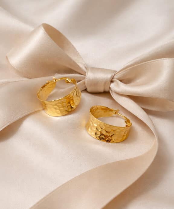 Den rustikke finish fanger lyset på en levende og organisk måde, hvilket skaber dybde og personlighed i designet. Den varme forgyldning tilfører et eksklusivt skær, som gør øreringene både elegante og markante på samme tid.