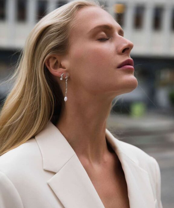 Flotte hvide ferskvandsperler i den moderne barokke stil, der giver denne skønne ørering et unikt præg når den hænger i øret. Øreringen måler 48mm (På den længste del, ørekæden bag øret). Perlen har en længde på ca.15mm.