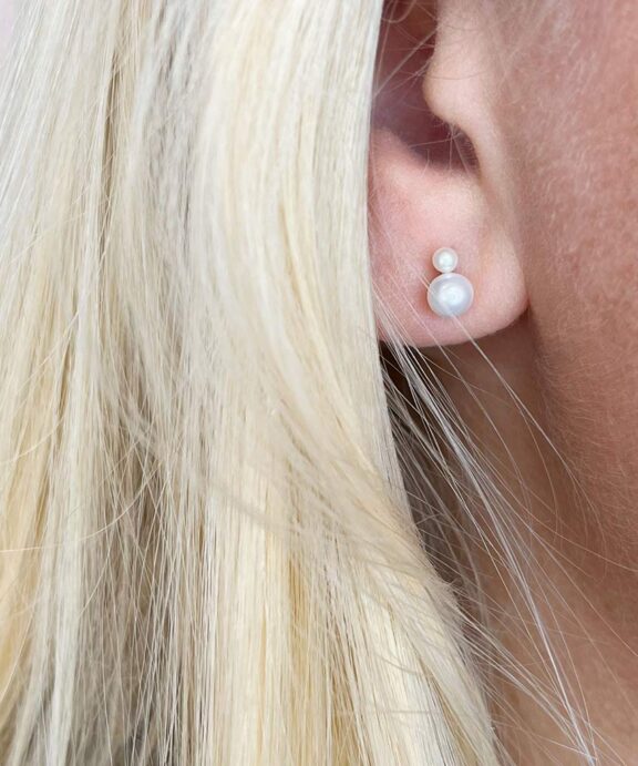 En fin og enkel ørestik med to hvide ferskvandskulturperler i to størrelser, der flot klæder hinanden og bliver på øreflippen. Øreringen har potentiale til at gå hen og blive en rigtig klassiker.