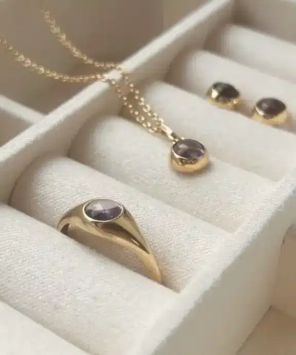 Denne smukke ring er lavet i 8 karats guld designet med en lilla ametyst isat.