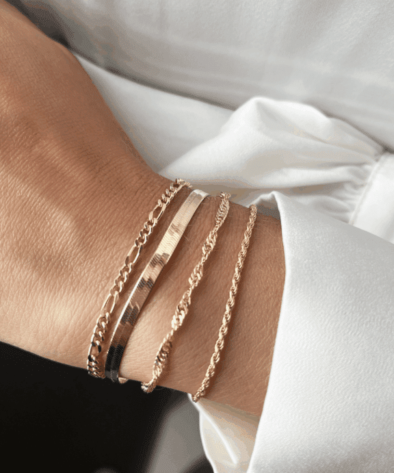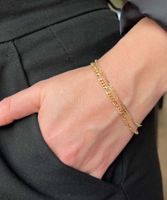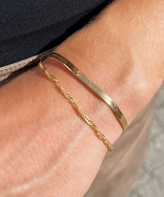 Sølv forgyldt armbånd i mønsteret singapore. Mønsteret er et snoet mønster de giver et spil spil på håndleddet. Armbåndet er 17,5 cm og kan forlænges med 1,5 cm.