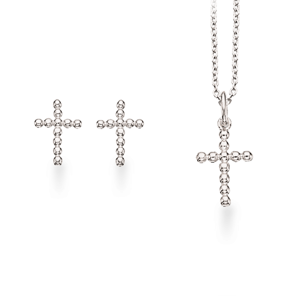 Tidsløst smykkesæt med kors ørestikker og vedhæng på kæde lavet ud af små, blanke sølvkugler.