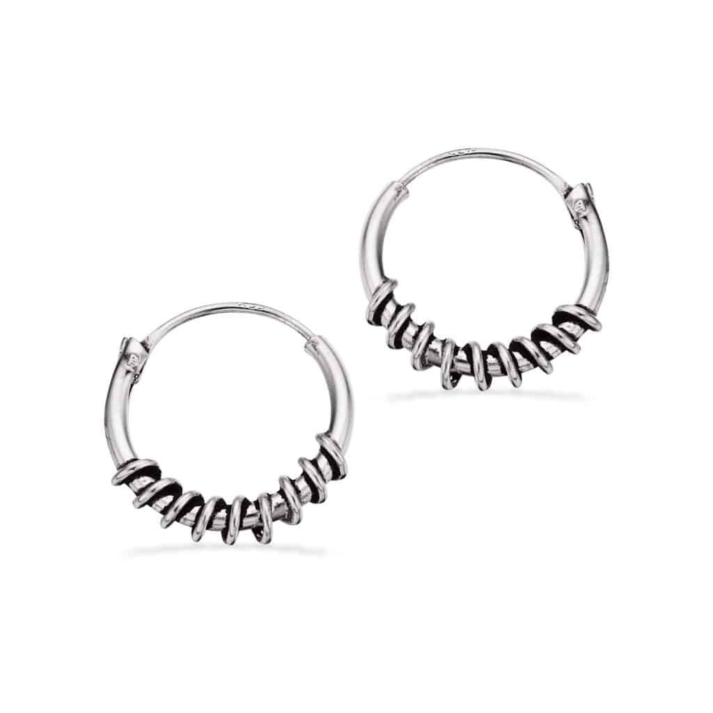 Creol ørehæng af sterling sølv med snoet tråd omkring i bunden. Mellem den snoede tråd er øreringen oxyderet, så der kommer større dybde og tyngde i smykket.
