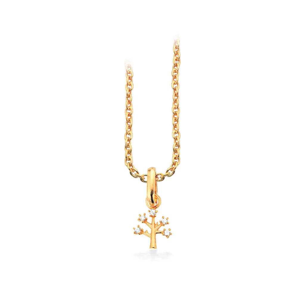 Flot sølv forgyldt halskæde med livets træ samt zirkoner i kronerne.