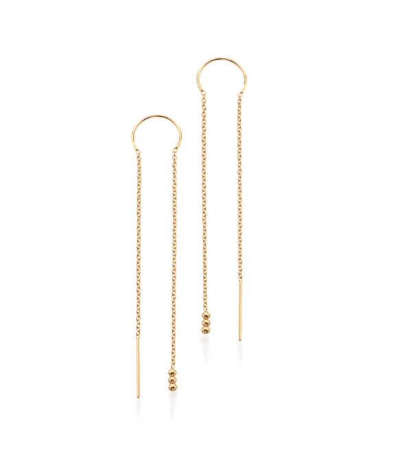 Sølv forgyldte øreringe som hænger med kugler. Ørehængerne er på kæde til at trække igennem øret. De er lavet med et fast stykke, der hvor de skal sidde igennem øret.