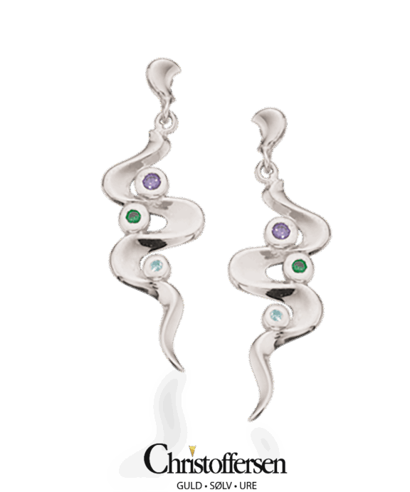 Sølv øreringe som hænger med forskellige farvede syntetiske zirkonia. Hængerne er på stik hvor den hænger løst. Hængerne snoer sig og imellem sidder de farvede zirkonia.