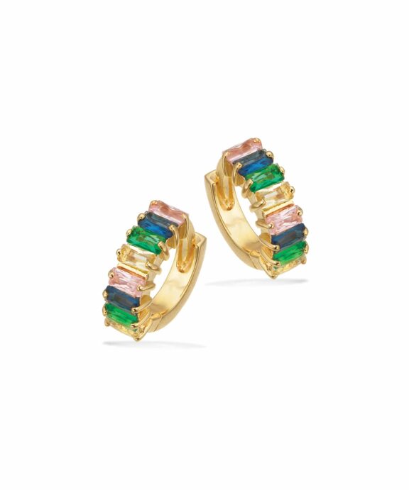 En fin mindre creol med knald på grønne farver understøttet af sarte farver. Øreringen er flot med store baguette formet zirkonia der ligger i en flot række med masser pang.
