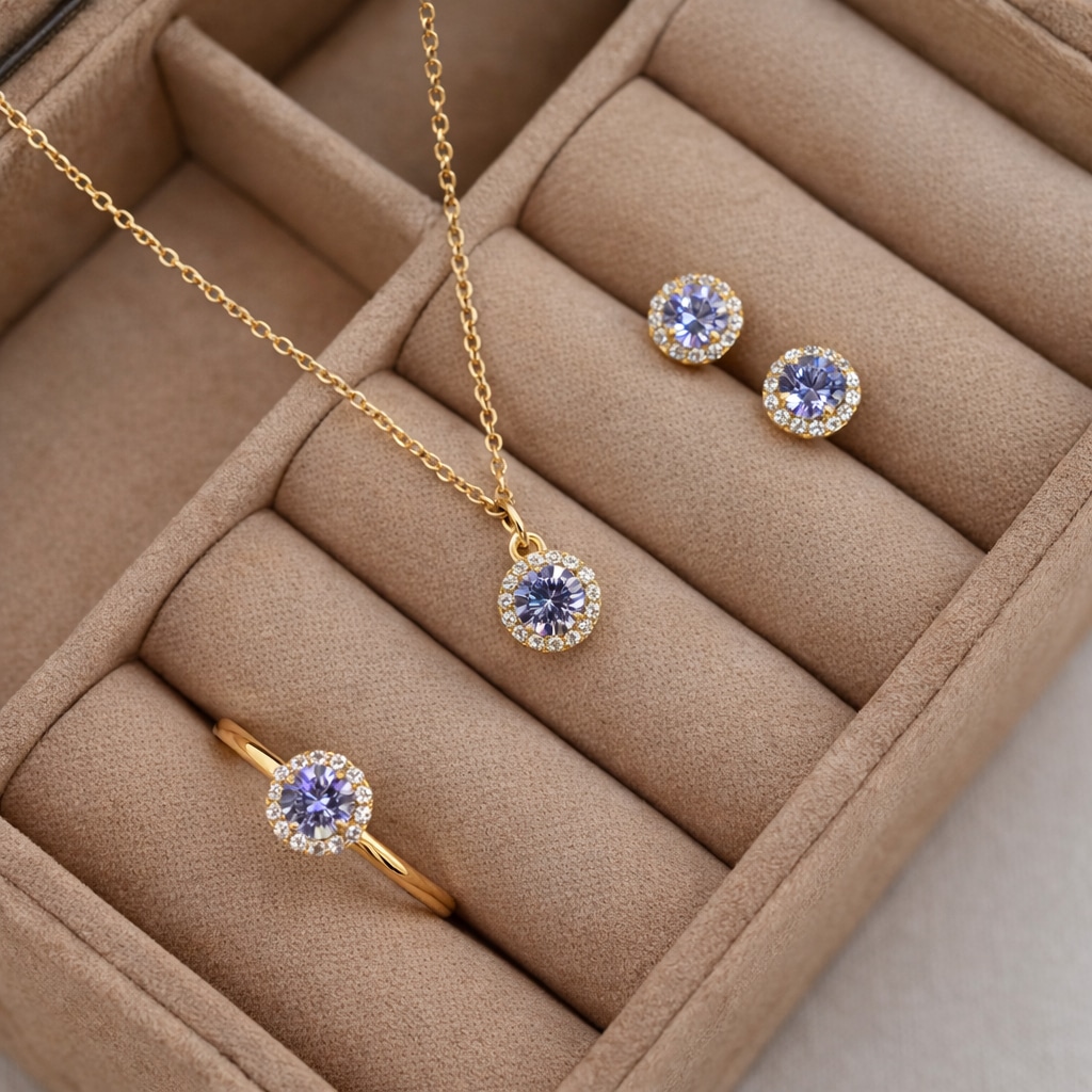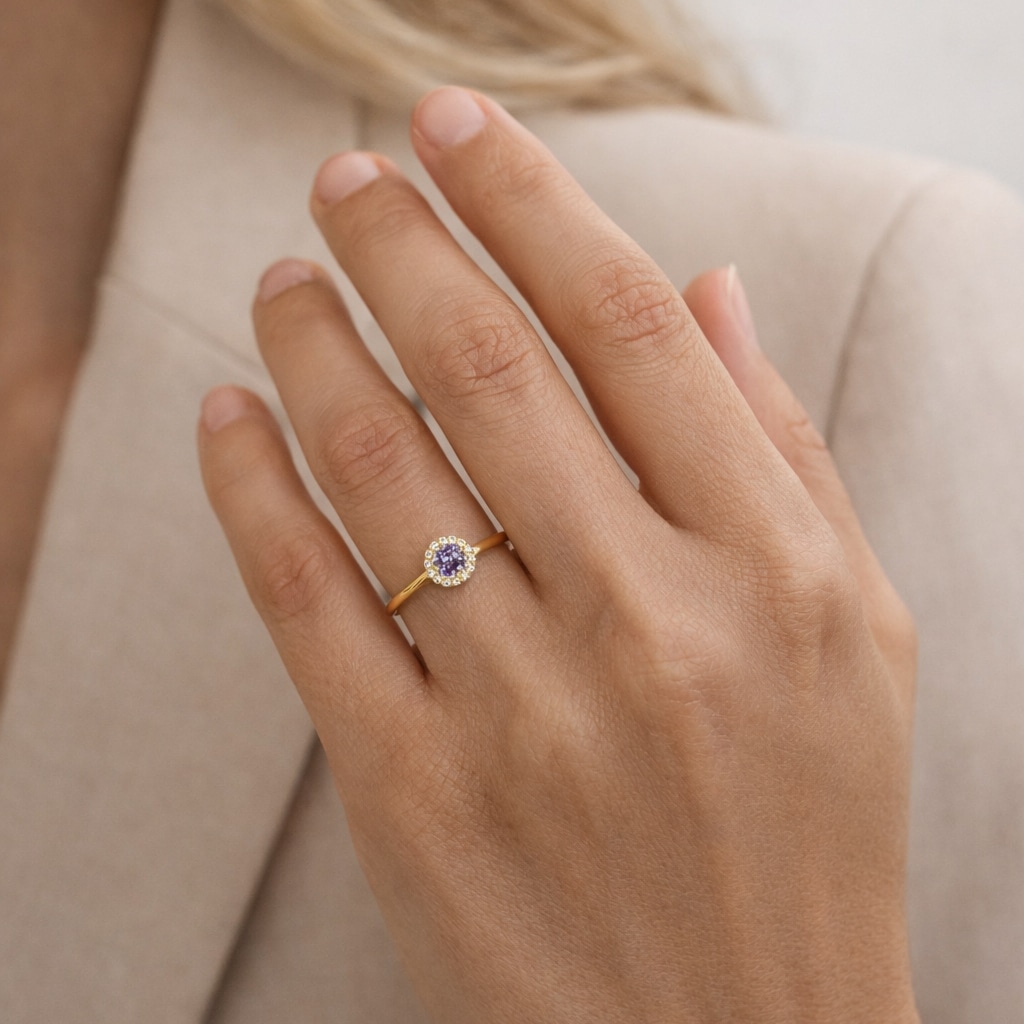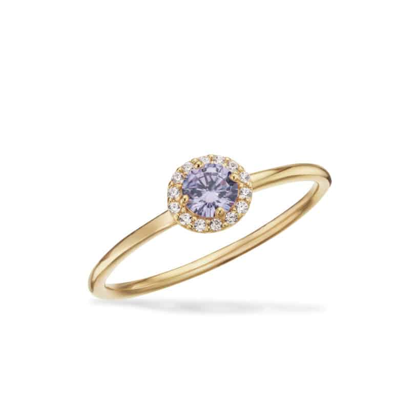 Ringens klassiske rosetdesign er prydet med en iøjnefaldende lilla zirkonia i centrum, omkranset af funklende hvide sten, der tilsammen skaber et sofistikeret og feminint udtryk. Den varme, forgyldte overflade giver ringen en luksuriøs glød, som fremhæver stenens farvespil på elegant vis.