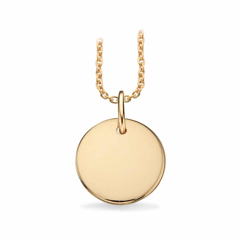 Smuk 8 karats guldvedhæng cirkel som er graverbar på begge sider. Vær obs på at selve halskæden er sølv forgyldt og har en længde på 45 cm som kan ombyttes efterfølgende.