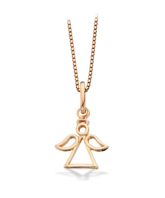 Dette fine vedhæng er fremstillet i 8 karat rød guld og er blank i overfladen. Vedhænget er designet som en engel som måler 11 x 11 mm. Til vedhænget følger en sølv forgyldt kæde som måler 42+3 cm.