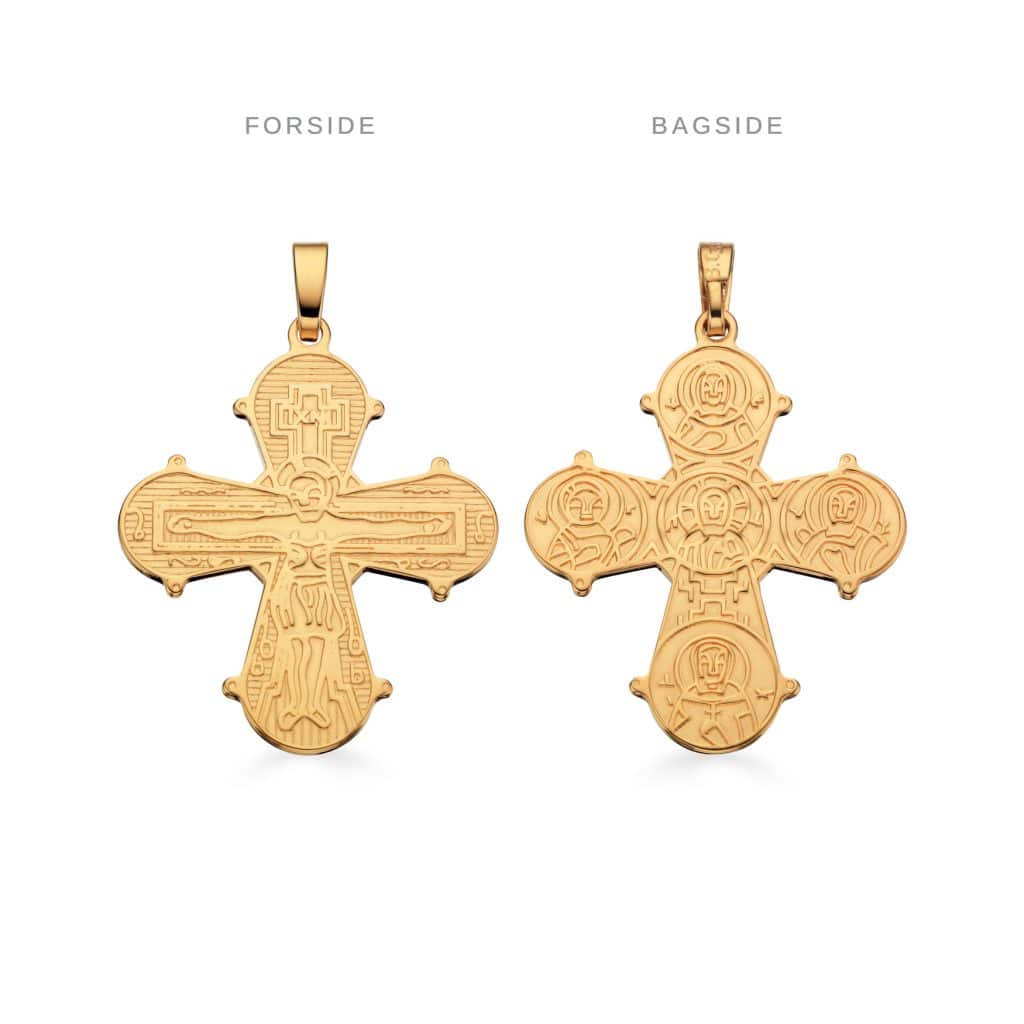 Disse sølv forgyldte dagmarkors er en meget klassik og tidsløs gave, de findes med tre forskellige motiver på bagsiden denne er med fadervor.