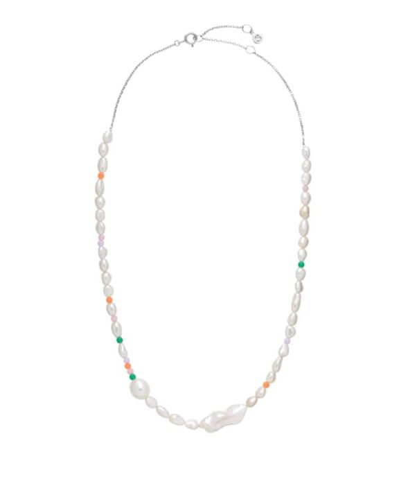 Sølv halskæde med ferskvands kultur perle. Denne halskæde er fremstillet i rhodiumbelagt genbrugssølv med både farverige resinperler og hvide ferskvandsperler. Barok perlerne er unikke og i forskellige størrelser og faconer. Halskæden kan justeres fra 40 til 45 cm.