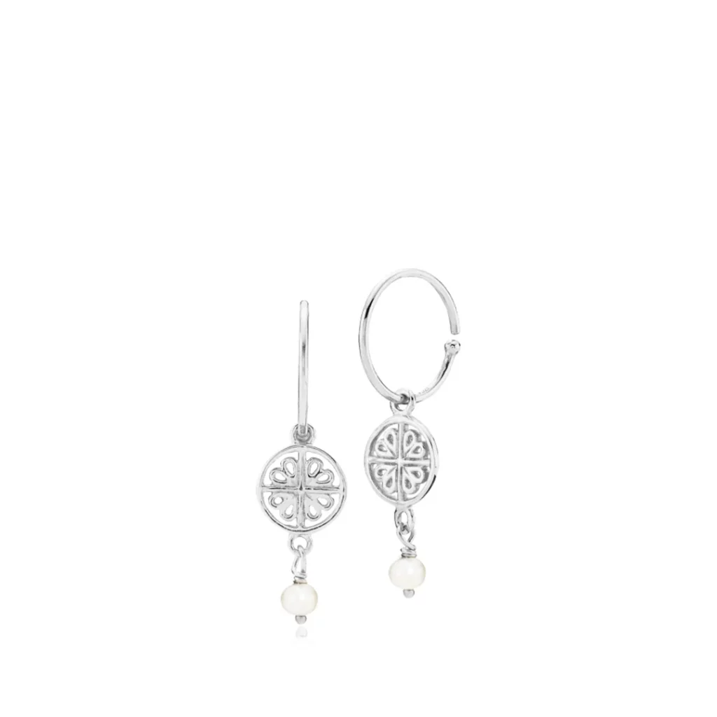 Disse elegante øreringe er fremstillet i 100% genanvendt sterling sølv. Øreringene er designet som små creoler hvor der hænger en rundt plade med mønster på i en hvid ferskvands perle i forbindelse med den. Øreringen måler 27 mm.
