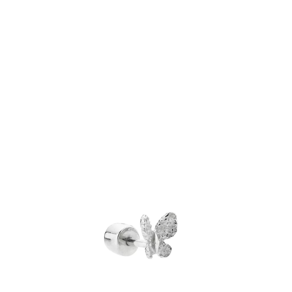 Denne søde ørering er fremstillet i 100% genanvendt sterling sølv. Øreringene er designet som en piercing og har en sommerfugl på som er banket i overfladen. Øreringen sælges enkeltvis og er perfekt hvis du har flere huller i ørene.