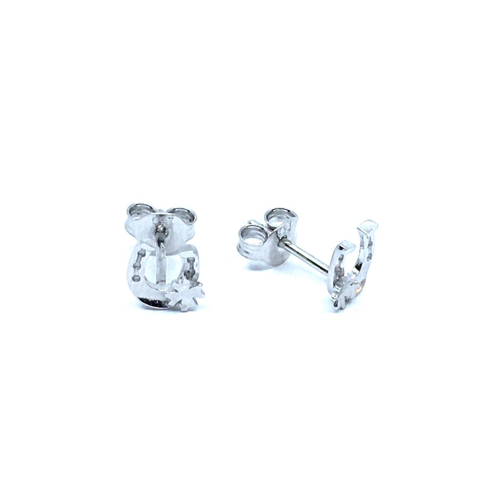 Sølv øreringe på stik med hestesko. På hesteskoen sidder en lille firkløver. Øreringene er rhodineret så de holder sig pænere i længere tid.