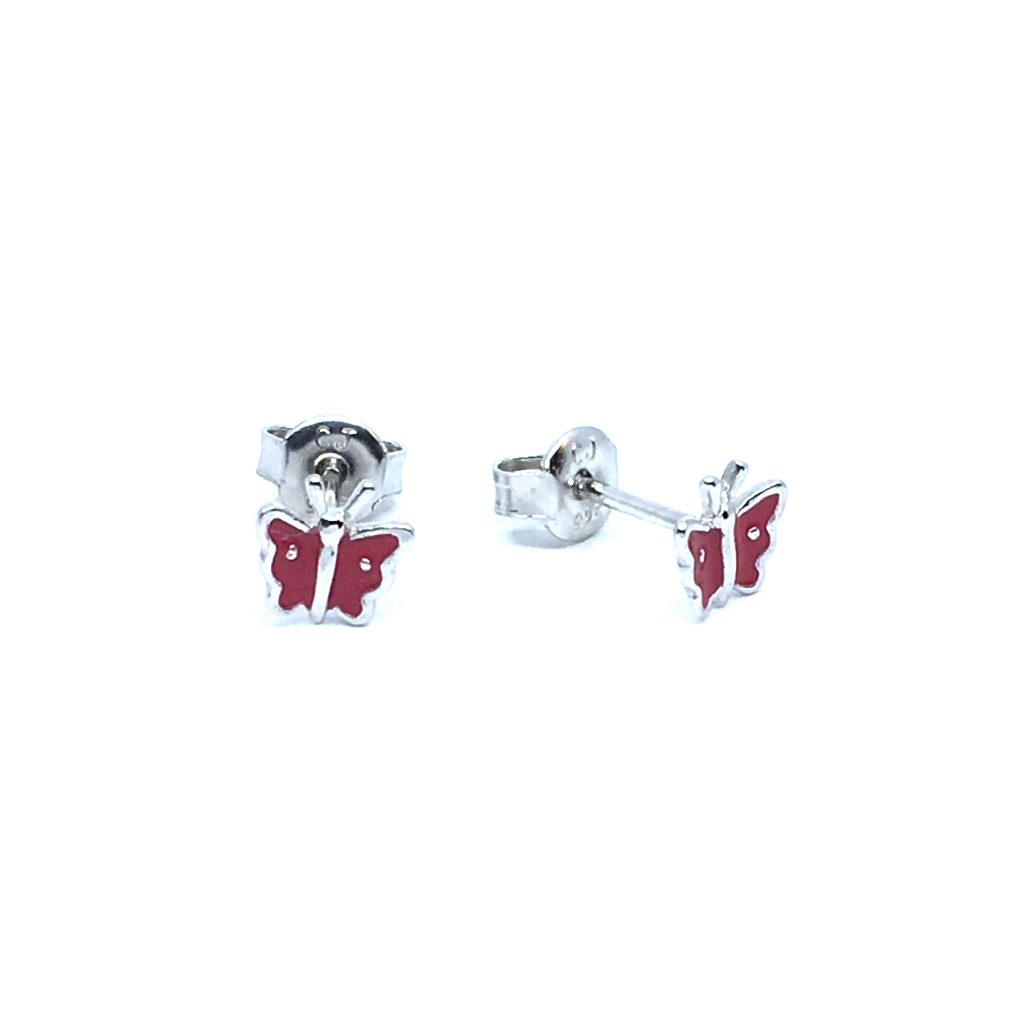 SØLV ØRERINGE STIK SOMMERFUGL MED LYSERØD EMALJE