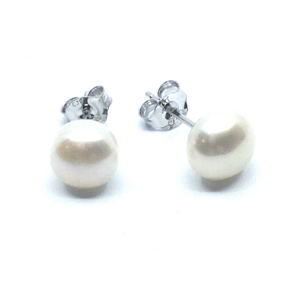 SØLV ØRESTIK RHODINERET MED HVID KNAP FERSKVANDSPERLE 8 MM