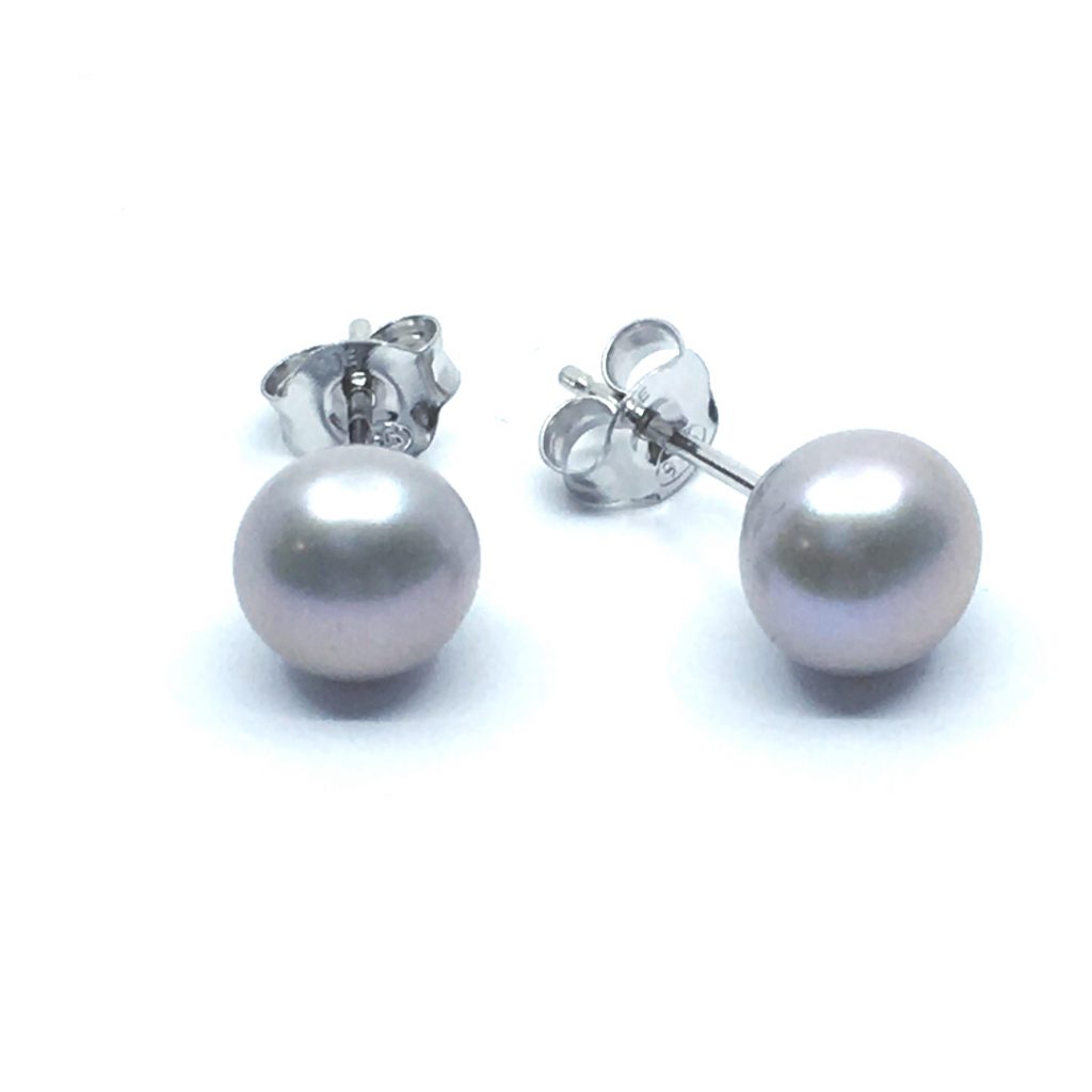 SØLV ØRESTIK RHODINERET MED KNAP LYS GRÅ FARVET FERSKVANDSPERLE 5 MM