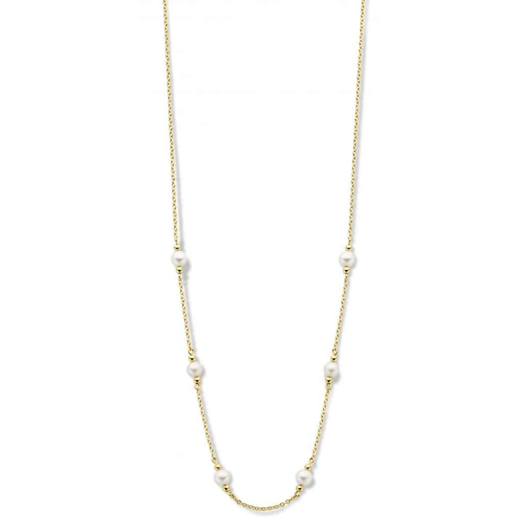 Halskæden er udformet af 925 sterling sølv forgyldt, med hvide ferskvands perler, kæden måler 45 cm.