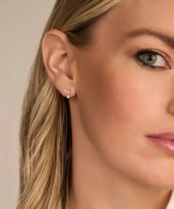 Elegant, men ikke for larmende. En fin lille ørestikker med stor personlighed. 4 glitrende stene i forskellige størrelser sidder fast på øret og en enkelt lidt større hænger lige under øreflippen.