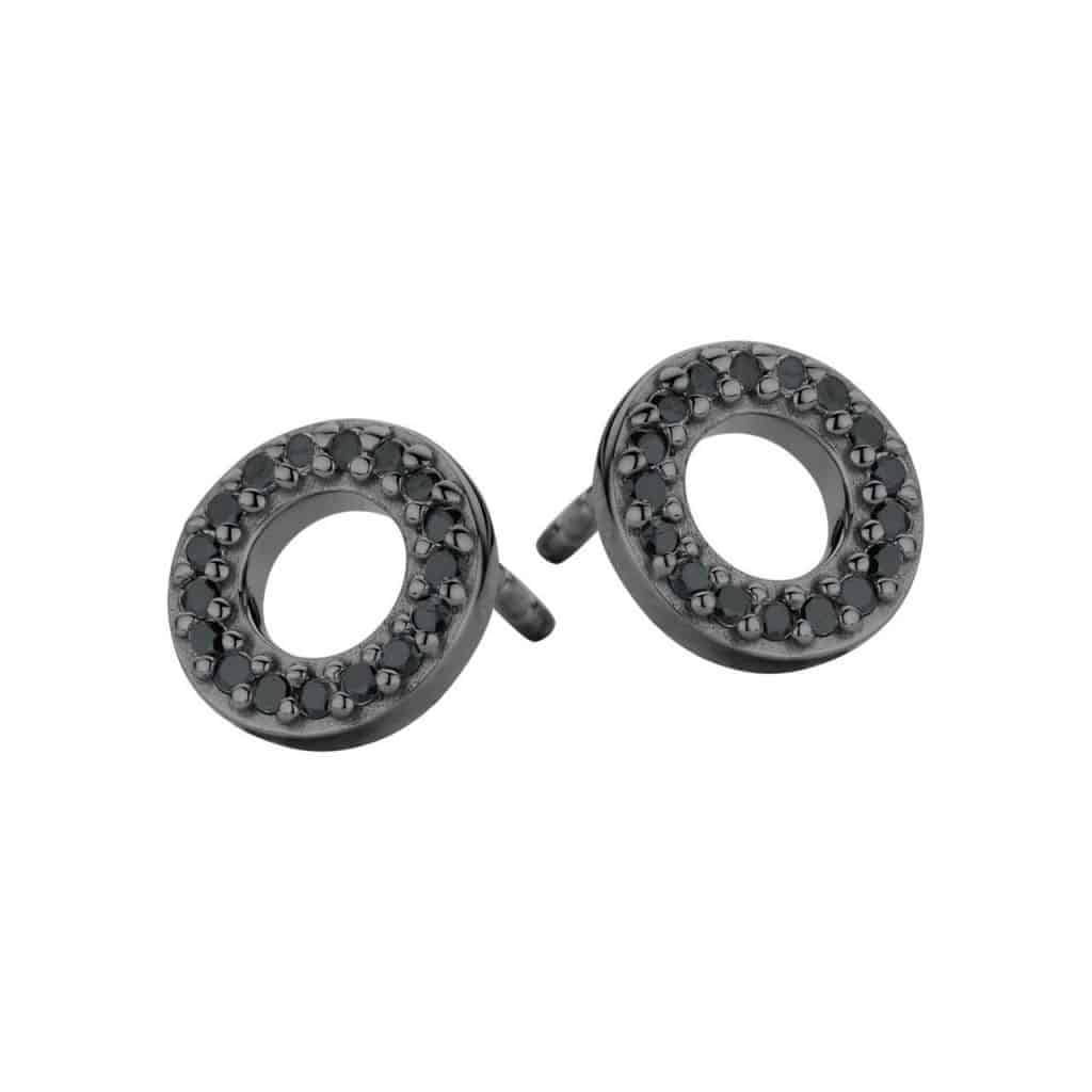Disse Trend øreringe er udformet med en blankpoleret overflade i sort ruthineret sterlingsølv. Ørestikkerne, der er designet som små åbne cirkler, er paveret med sorte zirkonia og skaber et elegant udtryk.