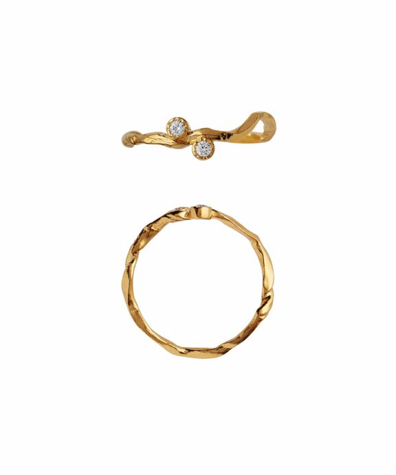 Organisk formet ring med 2 syntetiske zirkonia, der bølger på fingeren.