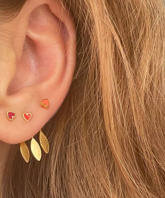 Øreringen er et lille fint rødt koral emalje hjerte