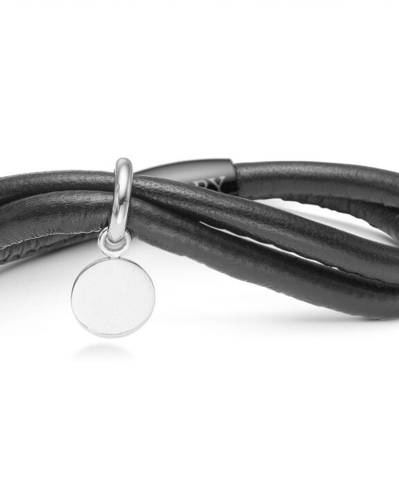 Kampagne armbånd fra STORY i sort læder med et møntvedhæng.