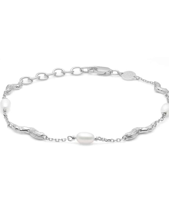 Smukt og enkelt armbånd fra Studio Z, med flotte, hvide ferskvandsperler, og et rustikt design.
