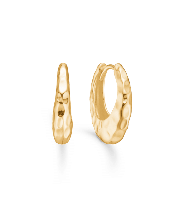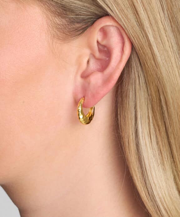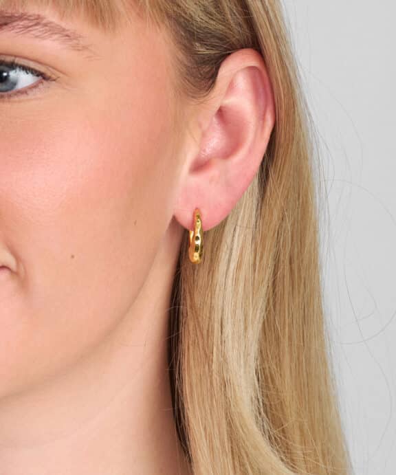 Øreringenes unikke “bumped” design tilfører et blødt, organisk udtryk, som fanger lyset smukt og giver et levende spil i overfladen. Den varme forgyldning skaber en sofistikeret glød, der komplimenterer enhver hudtone og gør dem ideelle til både hverdag og fest.