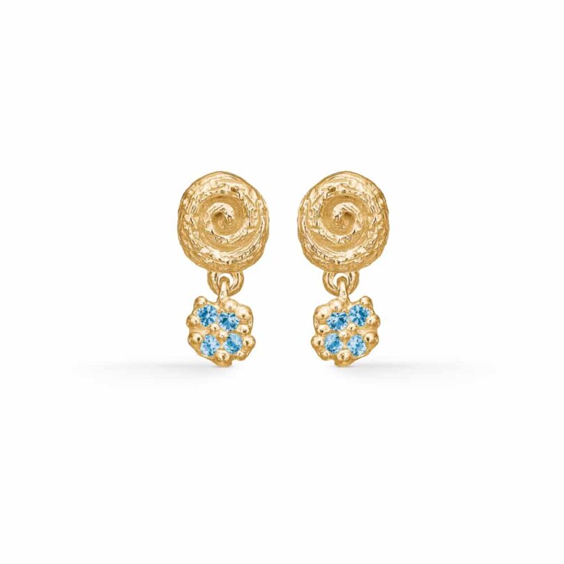 Betagende øreringe fra Studio Z i 925 sterling sølv belagt med 18 karat guld. Øreringene er inspireret af naturens skatkamre og er designet med blå zirkonia der symboliserer ro, fred og dybde.