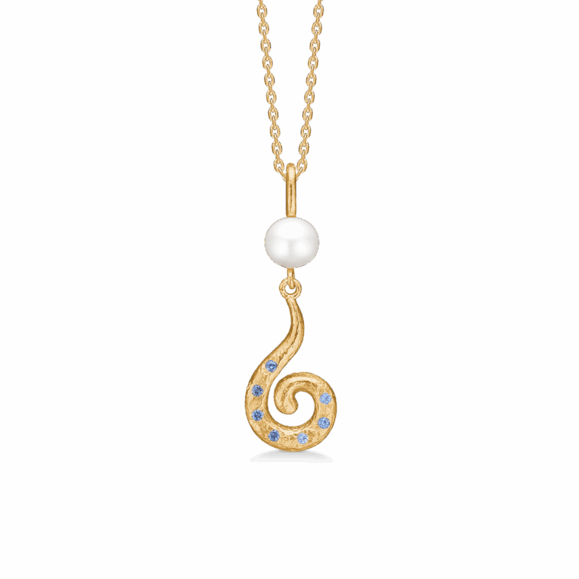 Vedhænget er prydet med en hvid kulturperle samt blå zirkonia.