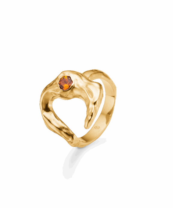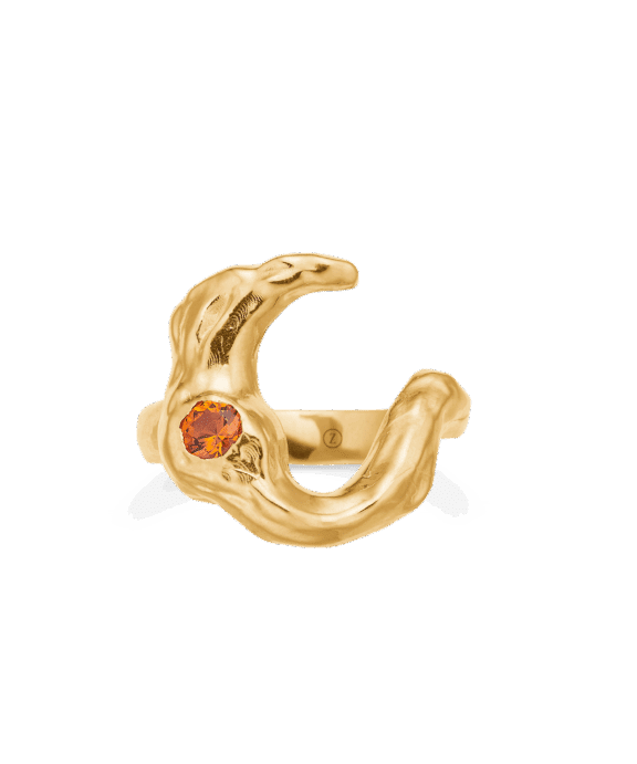 Denne smukke ring fra STUDIO Z er fremstillet i forgyldt 925 sterling sølv og har et unikt design, der forener klassiske elementer med moderne detaljer. Ringen er udsmykket med en stilfuld, hamret måne, der giver den et råt, men sofistikeret look. I midten af månen sidder en strålende orange zirkonia sten, som tilfører en flot kontrast og elegance. Perfekt til både hverdag og fest, vil denne ring være et iøjnefaldende og stilfuldt indslag i enhver smykkesamling.