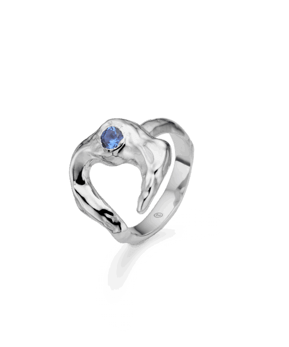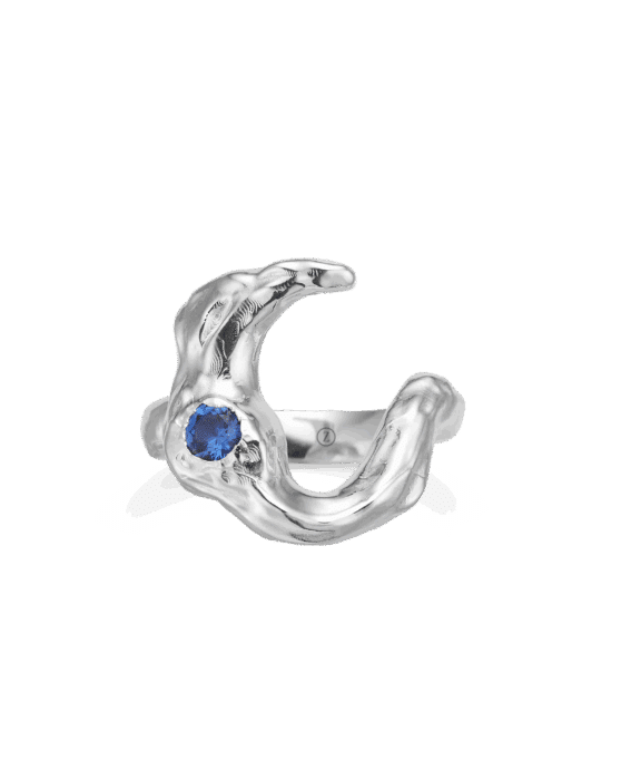 Ringen er prydet med en hamret måne, hvori der sidder en blå zirkonia.