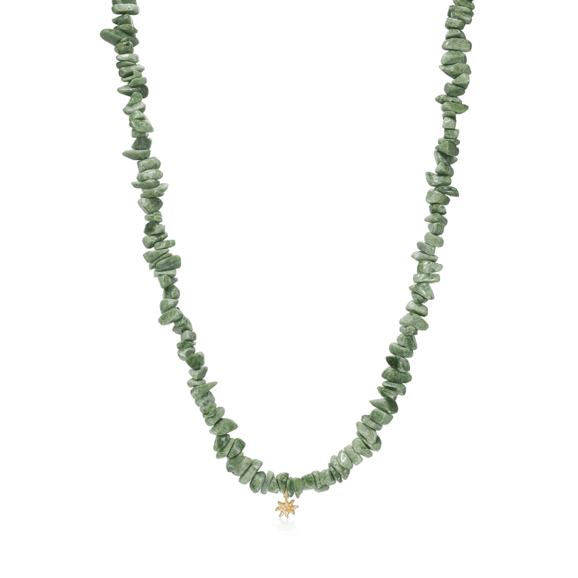 Ekstrem smuk halkæde med natur stenen chrom diopsid samt en smuk sølv forgyldt sol i midten.