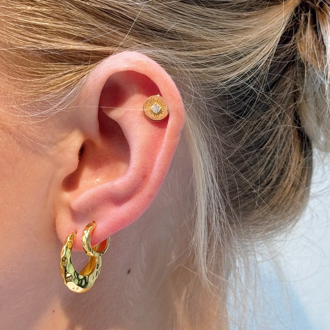 Øreringene er lavet i 925 sterlingsølv, som er belagt med en 18 karat forgyldning og i sat zirkonia sten.