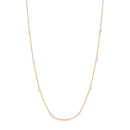 Halskæden er fremstillet i forgyldt sterling sølv med 8 hvide ferskvandsperler.