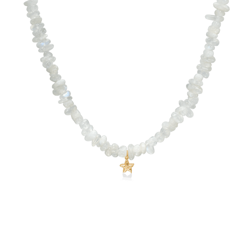 Utrolig smuk halskæde med små fine hvide månesten samt en forgyldt charm i midten, en lille søstjerne som symboliser alt ved stranden og havet. Perfekt halskæde til sommerkjolen.