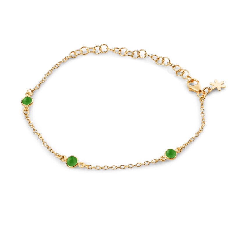 Fint tyndt armbånd med 3 små 5 mm cabochon grøn agat sten. Stenenes fine dybe grønne farve giver en god kontrast til den forgyldte ankerkæde stenene sidder i.