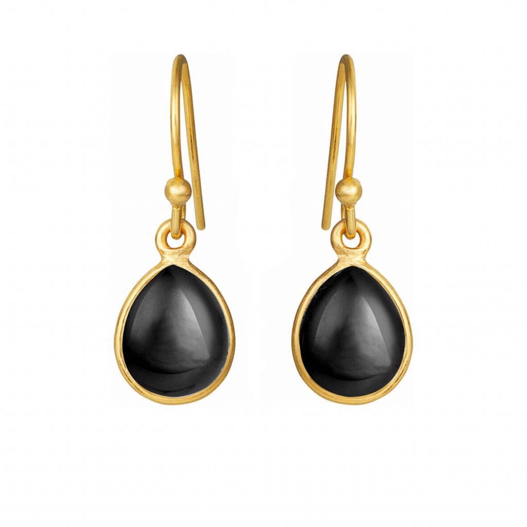 Disse skønne øreringe er fremstilet i guldbelagt sterling sølv. Øreringene er designet som ørehængere, som har en cabochon formet sort agat sten hængene fra bøjlen. Stenen måler 8×10 mm.