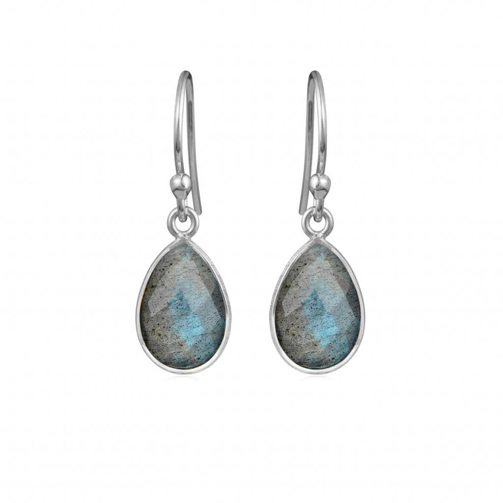 Changerende ørehængere i sølv med labradorit der kan bruges til hverdag og fest. Stenene er 8×12 mm og facetteret, hvilket hjælper de flotte farver i labradoritten til at skinne igennem.