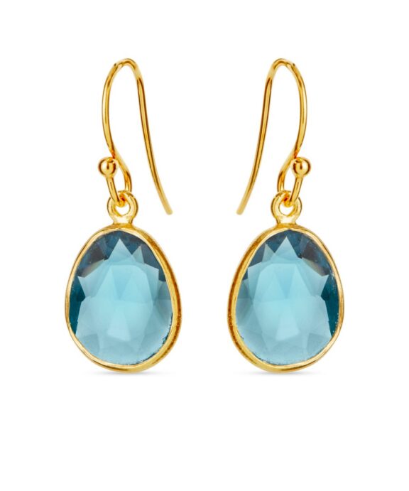 Smukke ørehængere i sølvforgylde med syntetisk blå topas. Stenen er facetslebne og måler 11 mm i bredden og 13 mm i højden. De fine øreringe er elegante nok til at kunne bruges til fest og simple nok til at kunne bruges til hverdag.