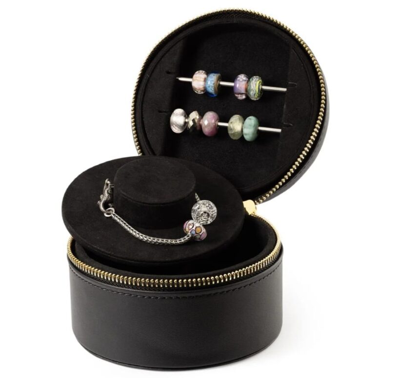 Dette elegante runde smykkeskrin er designet til opbevaring og organisering af dine smukke Trollbeads. Skrinet er sort med Trollbeads-logopræg på toppen, og smykkeskrinet er afsluttet med en stilfuld guldfarvet lynlås.