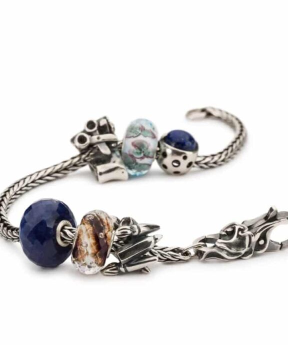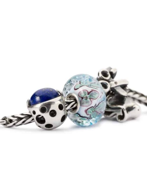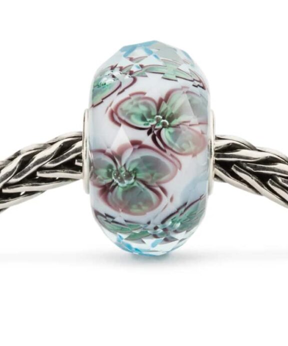 En smuk facetteret Trollbeads glaskugle med pastel lys blå baggrund og fine, grønlige blomster med rødbrun kant. En virkelig anvendelig og feminin kugle.